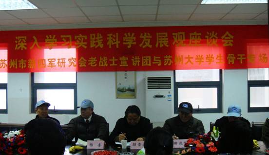 3月23日下午三点,文学院•新闻传播学院深入学习实践科学发展观座谈会――苏州市新四军研究会老战士宣讲团与苏州大学学生骨干专场在我校独墅湖校区文科综合楼1005幢5211会议室举行。本次座谈会由苏州大学关心下一代委员会和苏州市新四军研究会老战士宣讲团主办,由文学院•新闻传播学院关心下一代委员会、文学院•新闻传播学院团委、学生科协承办。苏州市新四军研究会副会长兼宣讲团团长杨奎等宣讲团成员、苏州大学关工委副秘书长、学生工作部(处)副部(处)长董召勤老师、文学院•新闻传播学院党委副书记、副院长刘海平老师、文学院•新闻传播学院团委徐海洋老师以及文学院•新闻传播学院学生党员、学生干部代表参加了座谈会。座谈会气氛热烈,与会老师、宣讲团老战士和参会学生代表各抒己见,畅所欲言。