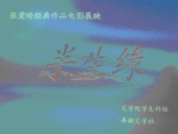 5月19日晚上六点半在文综楼1202,由文学院科协与弄潮文学社共同举办的张爱玲电影展播准时开始。本次电影展播播放的是由张爱玲的作品改编的电影《半生缘》。