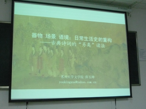 5月26日周二晚上6:30,在苏州大学独墅湖校区文科综合楼1003-3101教室,由文学院科协举办的读书笔记培训计划系列讲座之古典诗词的另类读法在这里顺利举行。此次讲座有幸邀请到苏大文学院薛玉坤老师作主讲。薛老师平易的话语,幽默的讲课风格,细腻的学术分析,图文并茂的讲解,吸引了来自各个学院的学生,讲座后同学们爆发出阵阵掌声。