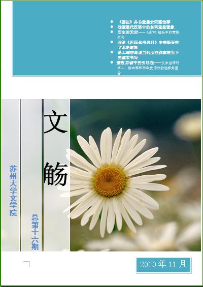 嗅着菊的清香,品砸着菊花的婀娜多姿,让我们共同欣赏篇篇“奇文”。本期《文觞》收录了2010年文学院“学士杯”本科生论文大赛的部分优秀作品。其中,有对当代作家苏童小说《碧奴》题材做的深刻思考,有以上海和香港城市为背景的女性文学为切入口的细致分析,还有对南斯拉夫电影《地下》展开的多角度剖析,等等。另外,我们还特别邀请了本次大赛主评委刘祥安教授撰文一篇,对论文写作提出指导性意见。相信以上内容都能使您在悠然阅读的同时,摭拾一份对学术研究的感悟与体会。