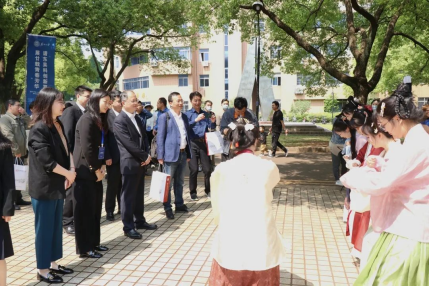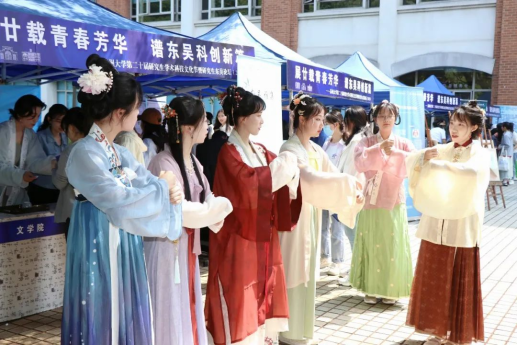 在悠扬笛声的伴随下,“华夏服裳纹礼彩”汉服展示活动吸引了大批师生驻足观赏。校党委副书记王鲁沛,研究生院院长张进平,学生工作部(处)长董召勤等领导、老师莅临文学院展位处参观指导,汉服展示者们热情大方地向各位老师进行展示与解说,不论是活动的内容形式之丰富,还是志愿者们的精神面貌之积极,无一不受到领导老师们的高度赞扬。