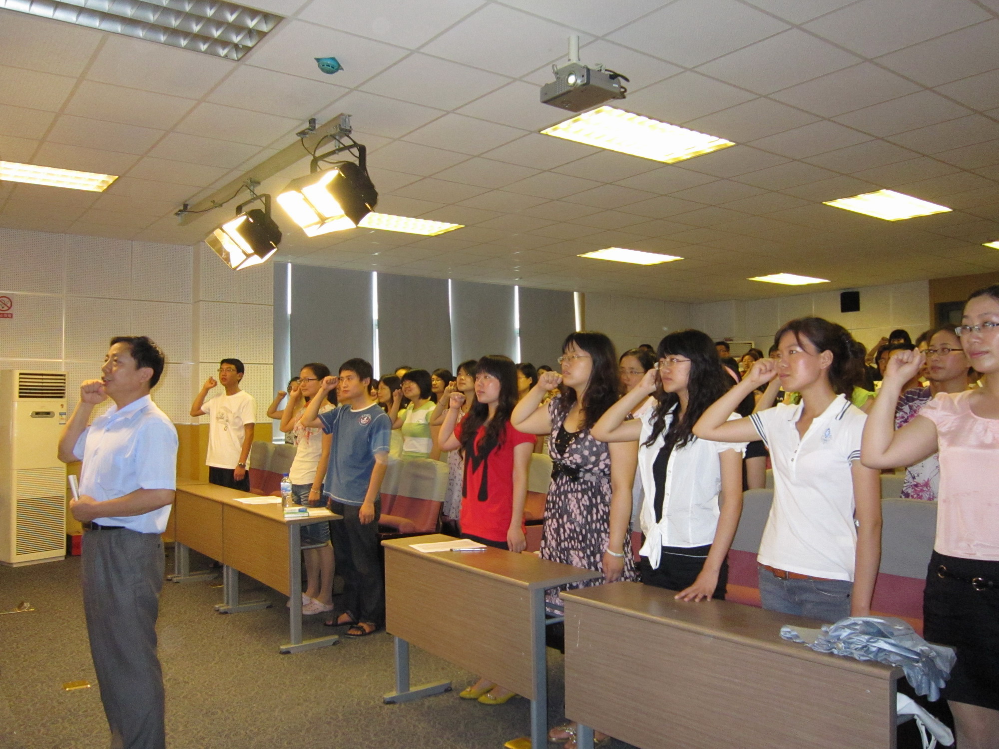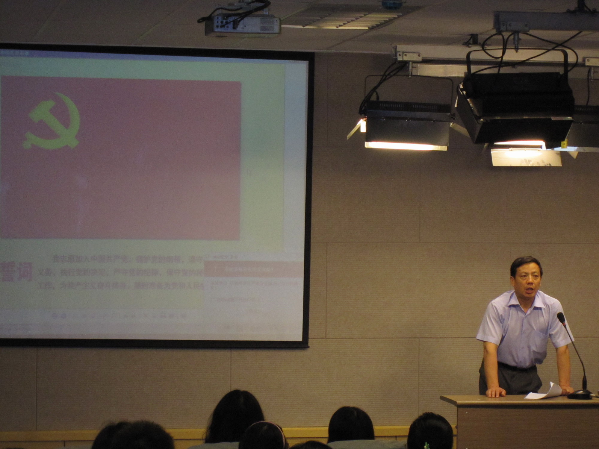 宣誓完毕,07支部的王洋同学代表新加入的党员做了简短发言。在表达了光荣与自豪的心情之余,他强调了做为一名党员应具有热心、责任心,不放松对党的基本知识的学习,加强党性修养的提高,不断完善自己;同时要以更严的标准来规范自己,发挥共产党员的先进性,做到在人生追求上有志气,为民谋利上有勇气,社会生活中有正气,个人得失上有大气。