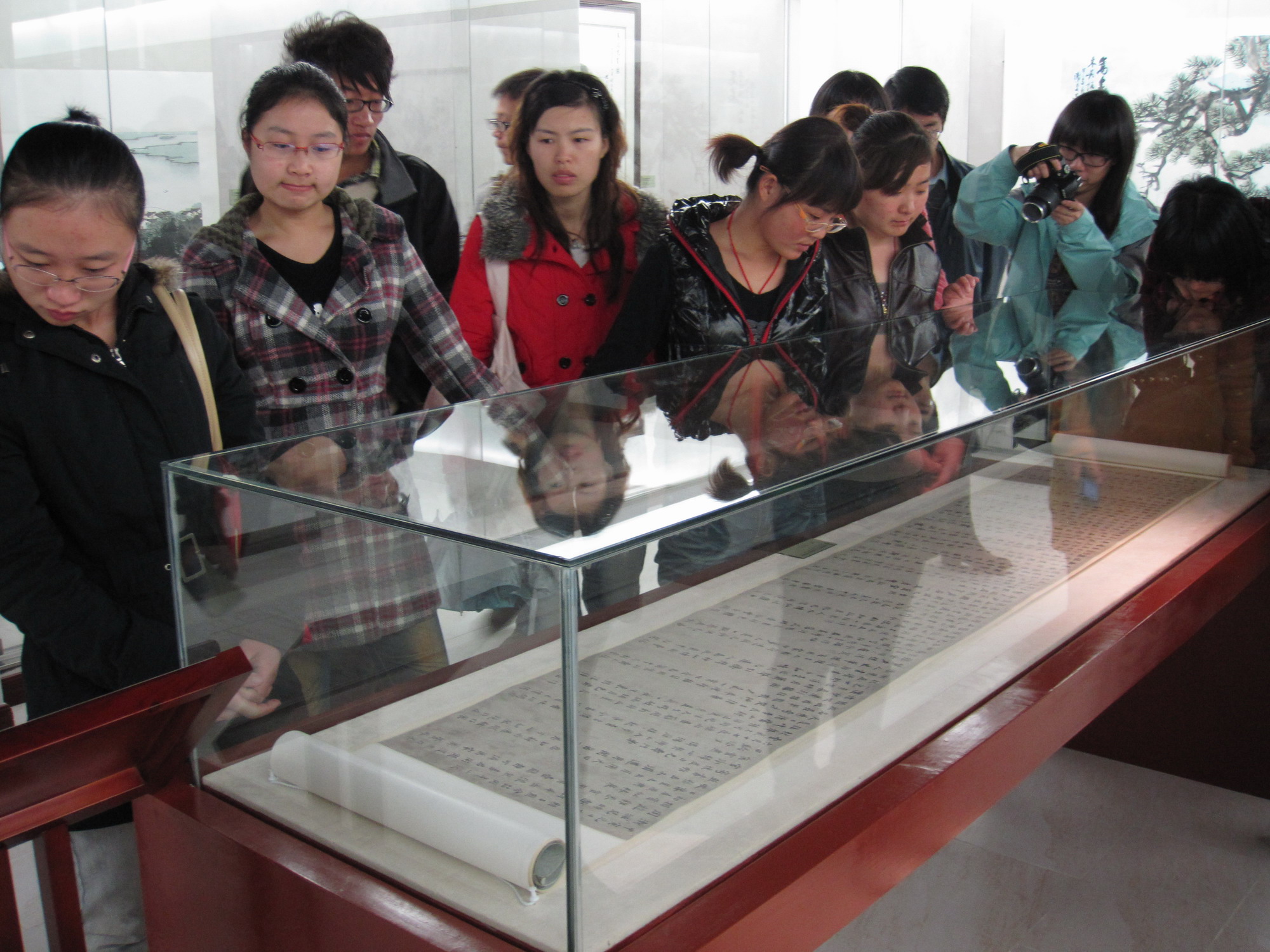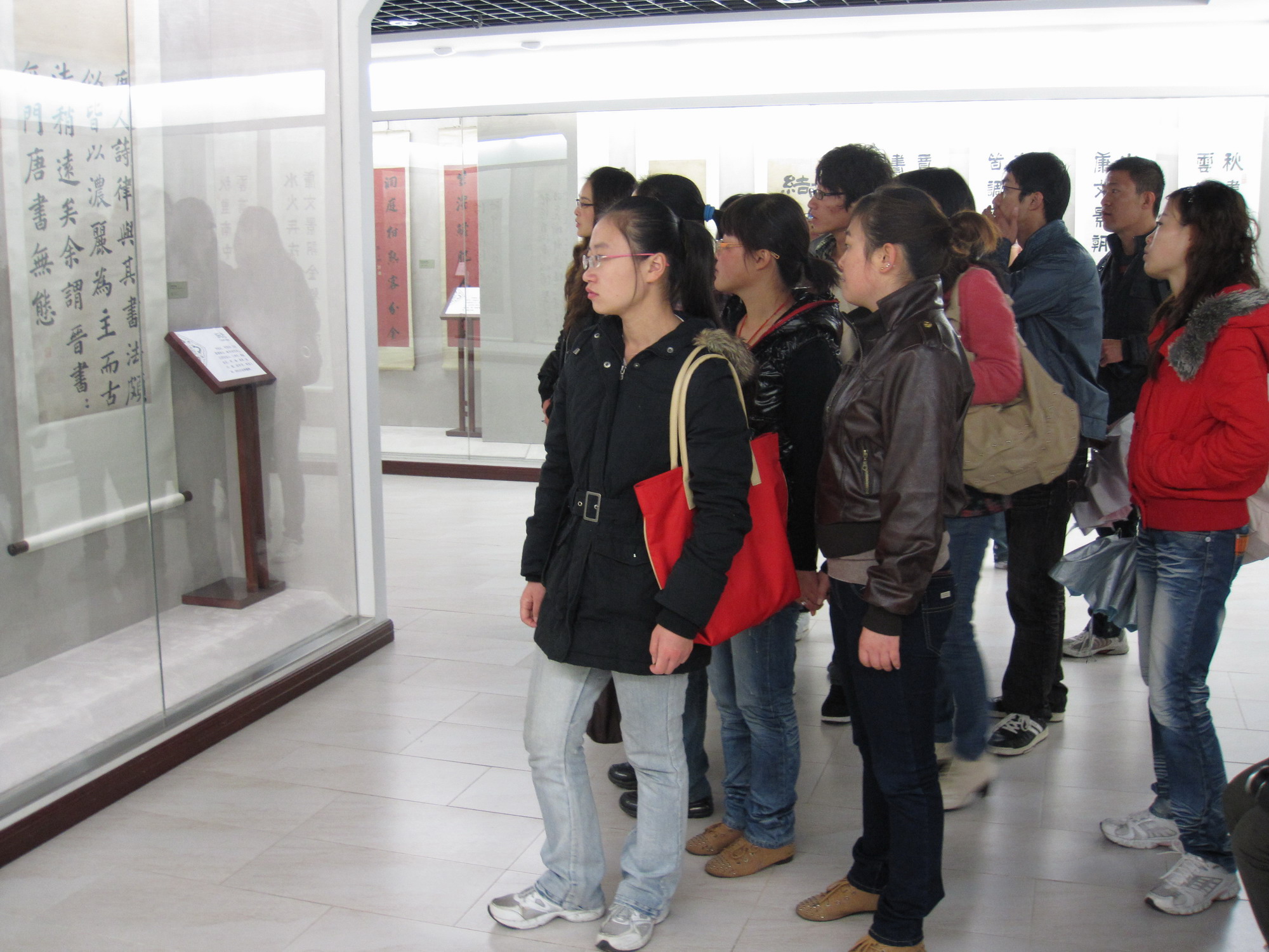 随后支部杨�同学,同时也是博物馆的兼职讲解员,引导大家依次进入馆内参观。杨�同学作为博物馆的讲解员,已经接待了许多来自社会各界的团体或个人,此次为同学们作介绍更是十分地流畅自然,熟练清晰。大家在她的带领下,观摩了知名校友为苏大110周年校庆而作的各种题词及捐赠的字画,参观了体育馆原址、东吴碑廊等。同学们或驻足聆听,或仔细观赏,认真地了解着一件件见证苏州大学发展的藏品。苏州大学博物馆中,从社会各界征集来的丰富藏品,具有较高的历史价值和社会价值,展示了苏州大学的独特魅力。大家边走边看的同时,更不忘认真地交流,作为文学院的同学,大家都对馆内收藏的独具艺术魅力的名家字画非常感兴趣。大家在认真了解藏品的相关内容和特点的同时,更是互相分享自己的观点和感悟,互相沟通,切磋琢磨。一个多小时的参观结束后,同学们还不忘在博物馆前合影留念。
