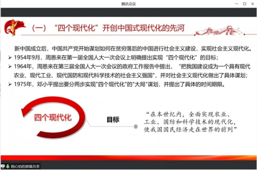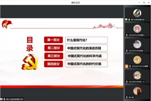 首先,韩心怡同学为大家讲解了什么是现代化,并通过视频材料追溯了近代以来中国各路仁人志士对现代化道路的奋勇探索。随后,韩心怡同学以时间为序,梳理了“中国式现代化”的演进历程。以马克思主义思想为指导的中国共产党开辟了中国现代化的新境界;1954年,周恩来首次提出“四个现代化”,开创先河;1957年,邓小平对“中国式现代化”作出具体阐释;以江泽民、胡锦涛为代表的中国共产党人为“中国式现代化”接续新篇;党的十八大以来,中国式现代化取得了一系列伟大成就,习近平总书记在二十大报告中系统深入阐述了中国式现代化的中国特色、本质要求和重大原则。