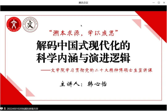 为帮助研究生深入学习党的二十大精神,了解中国式现代化的理论发展,苏州大学文学院研究生会与苏州大学马克思主义学院研究生会合作,于3月16日18:30举办了“溯本求源,学以成思”——文学院学习贯彻党的二十大精神博硕士生宣讲课,邀请苏州大学学习贯彻党的二十大精神博硕士生宣讲团成员韩心怡进行宣讲。