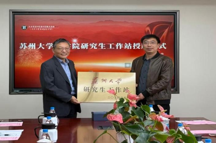为共同搭建创新人才培养平台,积极探索高等教育与基础教育的衔接机制,2025年10月22日上午,学院党委书记夏凤军,副院长周生杰,副书记、副院长纪金平及相关专业负责人一行赴江苏省苏州实验中学为其研究生工作站授牌。