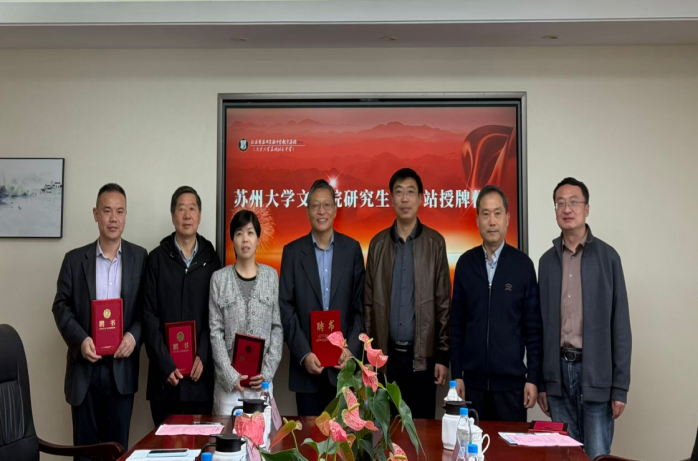 之后,夏凤军书记与张长松主任共同为“苏州大学文学院研究生工作站”揭牌。周生杰副院长、纪金平副书记一同为受聘指导教师颁发聘书。