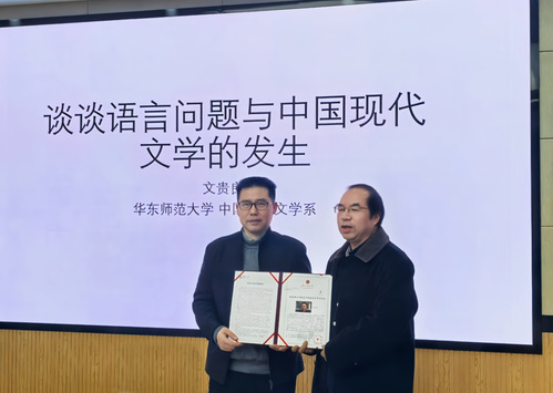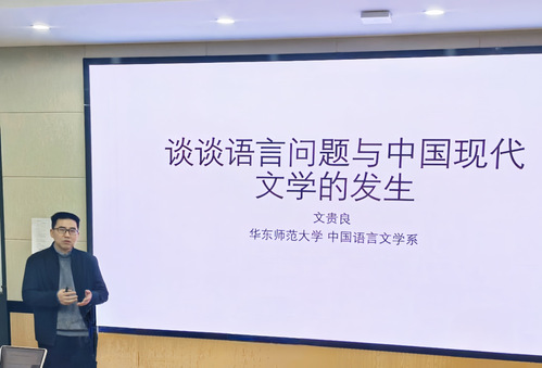 2024年12月26日下午,华东师范大学中文系系主任、中国茅盾研究会副会长兼秘书长文贵良教授在独墅湖校区文科综合楼5333会议室,以“谈谈语言问题与中国现代文学的发生”为题,为文学院本科生、研究生带来了一场精彩的讲座。本次讲座为文学院“仲联学术讲坛”系列讲座之一。讲座由苏州大学文学院院长助理陈昌强副教授主持。