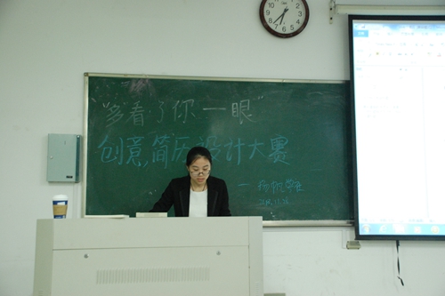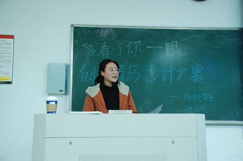 11月28日18时30分,“多看了你一眼”创意简历设计大赛在文科综合楼1003#3205教室如期举行。此次大赛由文学院学工办、团委主办,文学院扬帆学社承办。大赛评委由文学院倪祥妍老师和陶家骏老师担任。