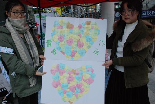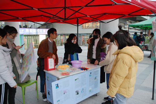 虽然这天的气温较低,风也很大,但这并不能削减同学们对于志愿者活动的热情,过路的同学纷纷来到摊位桌前,聆听青管部同学的解说,了解优秀志愿者的事迹。有的同学还在卡纸上写下了自己对于志愿服务的理解与感悟,分享自己的志愿体会,并将其投入心愿箱。每位参与者在完成游戏后也都愉快地和青管部志愿者们合影留念。看到同学们在欢快的气氛中加深了对志愿活动的认识,在场的志愿者们也在这个属于所有志愿者的节日里获得了快乐与满足。