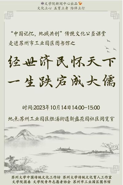 10月14日14:00,由苏州大学中国传统文化工作坊、苏州大学传统文化育人工作室、文学院团委、文学院青年志愿者协会及苏州工业园区图书馆联合主办,文学院青年志愿者协会承办的传统文化公益课堂“经世济民怀天下,一生跌宕成大儒”于苏州工业园区胜浦街道新盛花园社区阅览室顺利进行。
