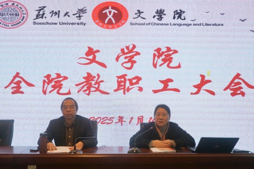 首先,曹炜院长代表学院领导班子进行述职。他从六个方面全面回顾了2024年学院的亮点工作。人才队伍建设上,王尧教授获评江苏省模范教师,是苏大今年唯一的获评教师;成功引进一位教授,弥补了学科语文师资短板;在弥补文艺学和比较文学的师资短板上有所进展;任命了两位80后院长助理。学科建设上,江苏高校品牌专业建设工程二期项目验收,汉语言文学专业获评“优秀”;2024年度省优势学科建设项目“中国语言文学”考核获评“优秀”。人才培养上,有21位2021级本科推免学生去往华东师大、北师大、南大等高校深造;首届八年一贯制本博贯通培养模式汉语言文学(拔尖创新班)顺利开班;学生在师范生教学基本功大赛选拔赛、江苏大学生读书文化节之书评大赛中取得优异成绩;全国博士学位论文抽检合格率100%。文学院2024年的最大亮点是在科学研究上有重要突破,先后获教育部人文社科优秀成果奖二等奖1项,国家哲学社会科学成果文库1项,国家社科基金重大项目1项,国家社科基金年度项目及后期资助项目6项,江苏省社科基金项目2项等。国际化建设上,首届文学院汉语言文学拔尖学生培养基地班赴澳门大学暑期研学;我院同哈佛大学东亚系共同举办了“世界中的中国当代文学”国际研讨会。创收工作上,文学院共举办了74个培训班,取得了良好的成绩。同时,曹院长也指出了学院目前存在的问题,强调要在科研论文发表与课程、教材和教学评奖显示度方面下功夫。