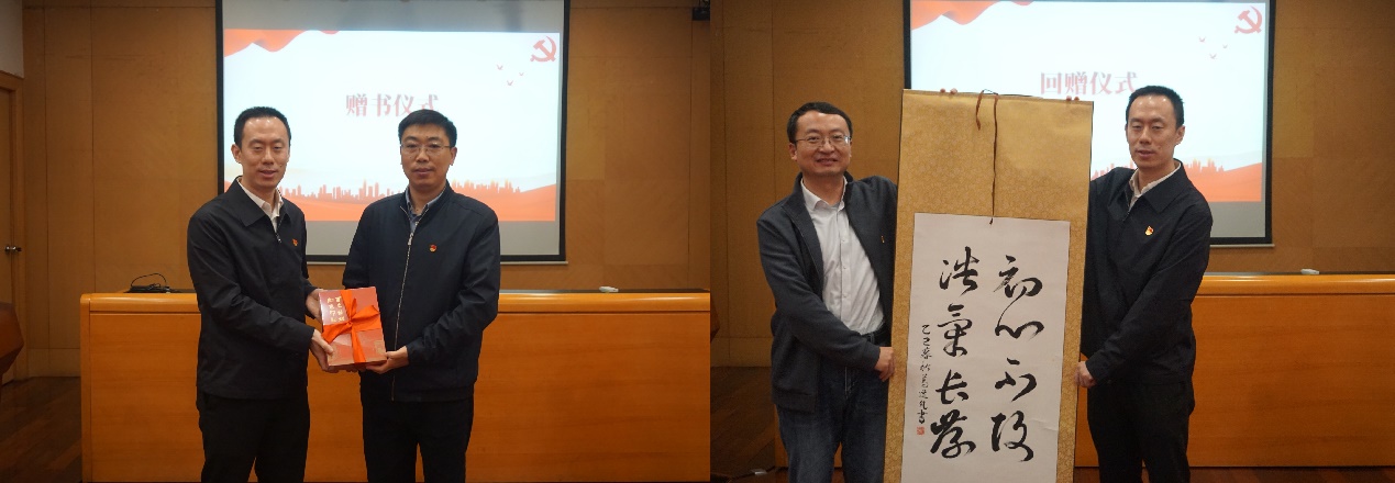 钱海代表市委党史工办向苏州大学文学院捐赠了一批红色书籍,为文学院的红色文化建设增添了宝贵资源。作为回礼,纪金平向党史工办赠送了葛逸凡同学的原创书法作品。双方均期待以此次活动为契机,持续深化合作,共同推动红色文化传播与青年思想引领工作。