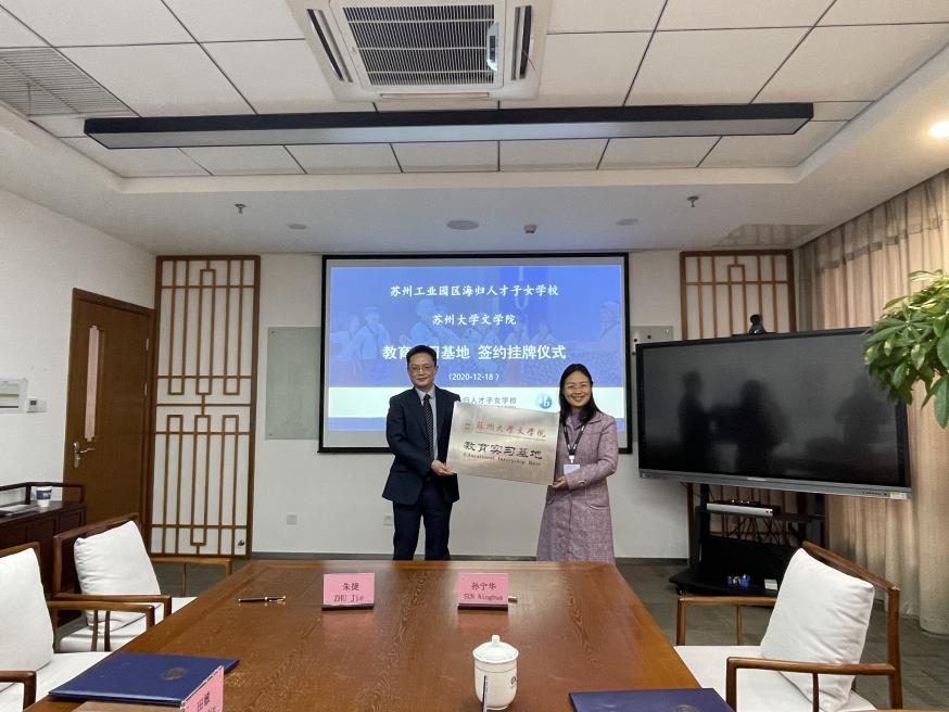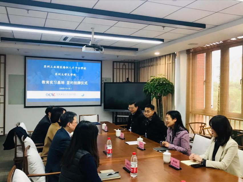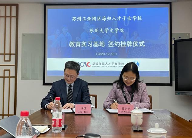 为进一步促进校园合作,共同探讨汉语国际教育专业毕业生素养需求等人才培养问题,拓宽学院学生的就业渠道,共育英才。2020年12月18日上午,苏州大学文学院再一次拜访了苏州工业园区海归人才子女学校(下简称OCAC),并成功举办了教育实习基地的签约挂牌仪式。出席本次会议的有苏州大学文学院党委书记孙宁华、汉语国际教育教研室主任陶家骏、中锐集团教育副总裁、OCAC总经理朱捷、中方执行校长田敏、小学部校长俞云花、小学部副校长缪玲玲等。