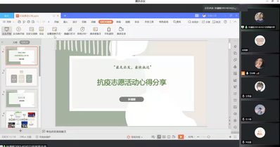接着,由倪润梅同学向大家分享抗疫感悟。面对疫情的突然袭击,她积极响应苏州市疫情防控的号召,在所在地区作为志愿者参与抗疫工作,抵御严寒,耐心疏导参与核酸检测的人员,辛苦却义无反顾。
