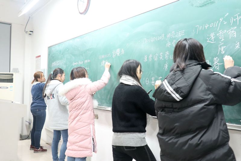 本次比赛的评委除了来自大一、大二各班的八名大众评审,还有胡萱老师、陆亚桢老师以及学生会主席团。比赛分为两部分:硬笔和软笔书法比赛由同学们自行报名并上传作品至线上,学生会将采取线上投票的方式,各选出五位优秀作品,为获奖同学颁发相应的奖品和荣誉奖状;粉笔字比赛于13日在文综楼举办,其中17级师范一班的选手在3205教室、师范二班和18级选手在3206教室比赛。比赛要求参赛选手们按照次序分组上台,在黑板上板书刘长卿的《逢雪宿芙蓉山主人》,创作完成后由工作人员记录并上传。
