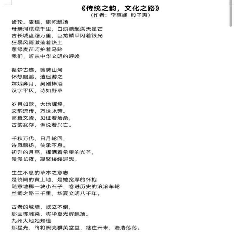 专硕第一党支部的李惠娴、殷子惠以弘扬中华优秀传统文化,树立文化历史自信为主题创作了现代诗歌《传统之韵,文化之路》并配乐朗诵,诗歌中,青年学子听从中华文明的呼唤,回望中华文明的丰硕果实,立足当下,于文化自信之路上继往开来,以磅礴的气势、激昂的笔调展现出苏州大学文学院学子的文化底蕴与青春风采。