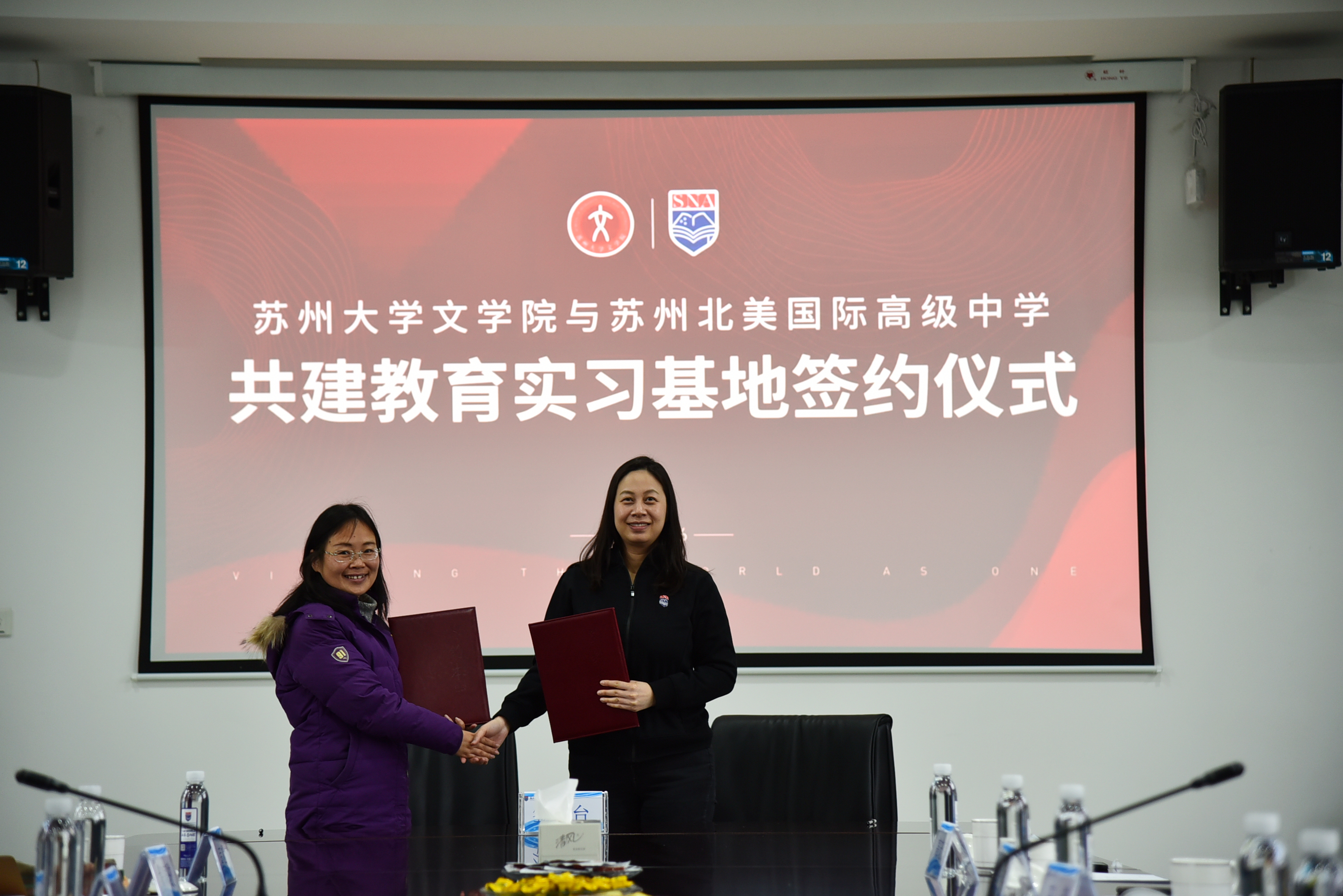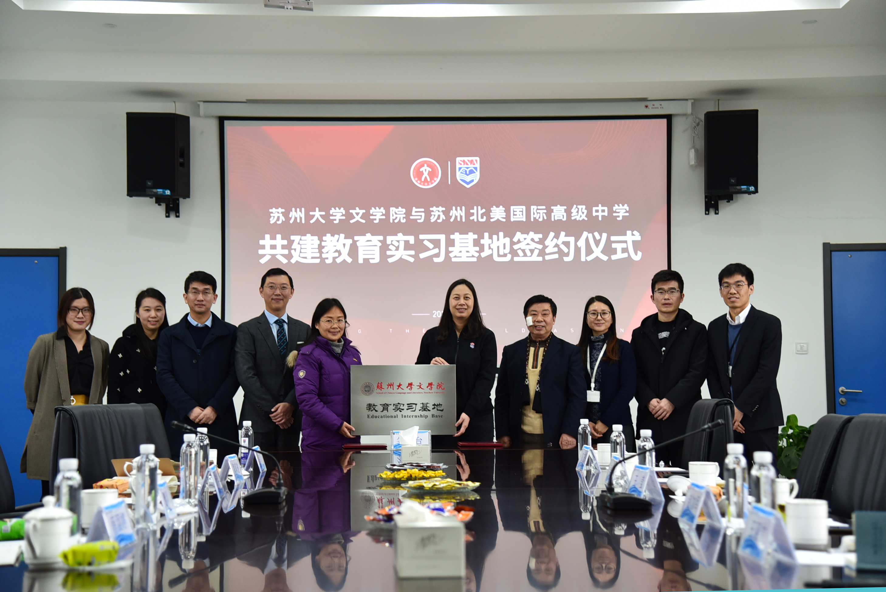 2021年1月6日上午,苏州北美国际高级中学与苏州大学文学院共建教育实习基地签约仪式在苏州北美国际高中成功举行,苏州北美国际高级中学总校执行校长王莹博士、党支部书记赵加军、副校长吴光宇、校长助理兼教务处主任高宏伟、校长助理兼校办主任王亚文、苏州大学文学院党委书记孙宁华、办公室主任赵曜、海外教育中心主任陶家骏、汉语国际教育专业硕士专业主任吉旭、留学生辅导员薛羽婷出席签约仪式。