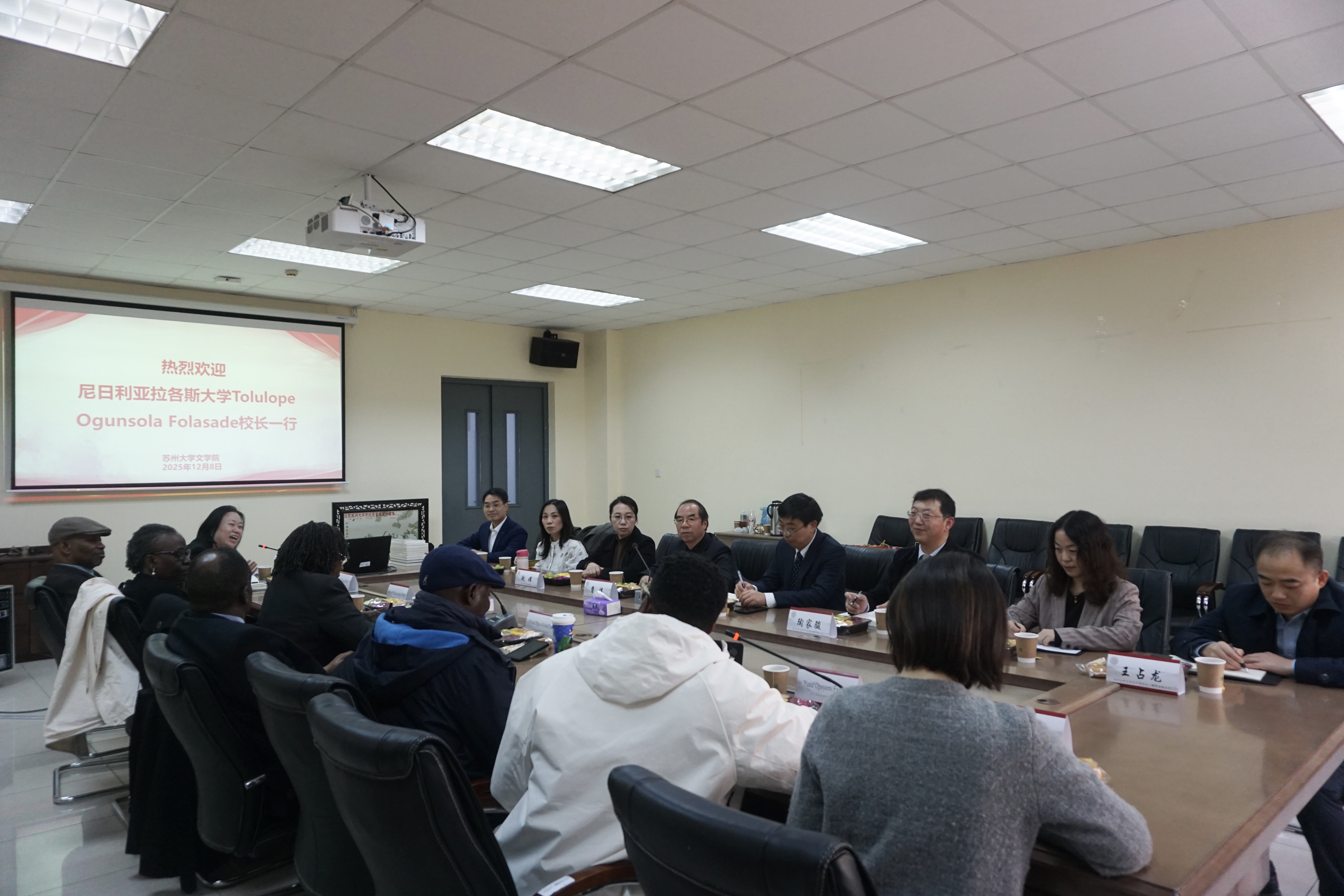 曹炜对尼日利亚拉各斯大学一行的到来表示欢迎。他指出,苏州大学文学院是在东吴大学文学系基础上发展起来的,与苏州大学办学历史一样悠久。截至目前,学院在优势学科发展、人才队伍建设、招生录取、在院师生的质量和规模、科研成果等方面都取得了显著的成果。教学和科研开展有序,持续向好发展,学院连续五年获得学校高质量发展综合考核第一等次。希望未来双方能够深化交流互动,依托各自特色,进一步在人才培养方面加强合作。