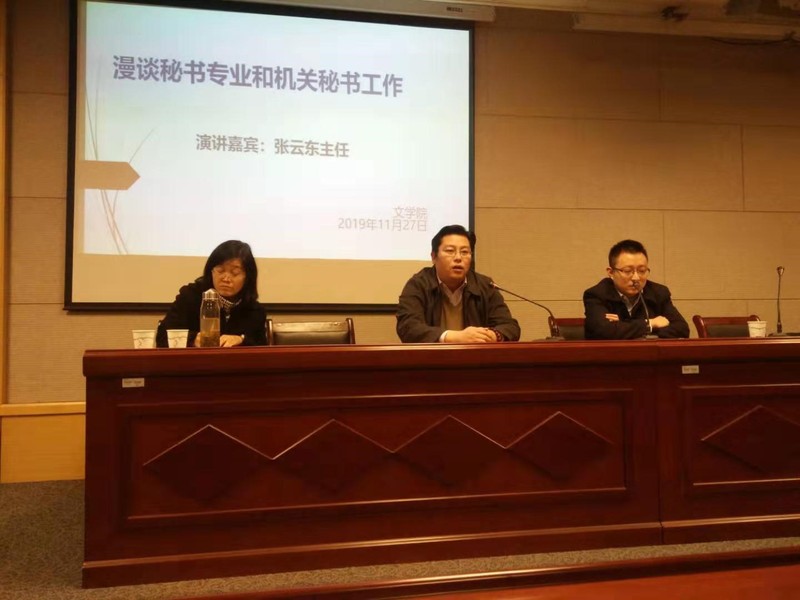 2019年11月27日晚七点,苏州大学文学院秘书学专业“漫谈秘书专业和机关秘书工作”主题讲座在1005#5339会议室举行,讲座由秘书学专业优秀毕业生、苏州市检察院办公室张云东主任主讲,文学院党委副书记阴浩老师主持,秘书学专业教师和各年级本科生参与了本次会议。
