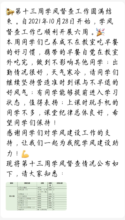 在诸位督查员的辛勤付出与学院同学们的积极配合之下,学风督查工作取得一定成果,早退、缺勤等不良现象得到明显改善,课堂纪律良好,营造了积极向上的学习风气。希望同学们继续专心听讲,查缺补漏,充分利用大学时光提升自己,在大学课堂上留下自己努力的身影和奋斗的痕迹!