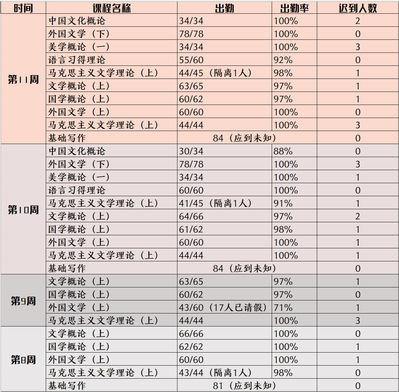 为营造良好学习氛围,紧抓学院学风建设,文学院学生事务与发展中心应学院要求开展了为期九周的学风督查工作。学风督查员由文学院本科学生党支部志愿者与学风建设部成员组成,针对院内中国文化概论、外国文学、美学概论等部分大类基础课与公共选修课带早餐进教室、迟到、早退、上课玩手机等不良行为进行督查,取得一定成效。