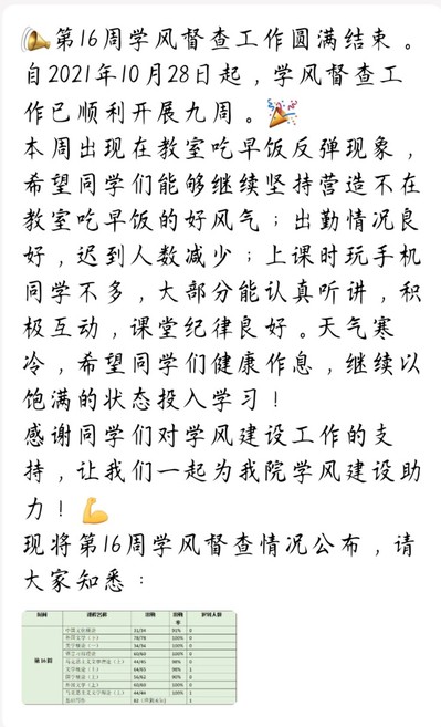 本学期学风督查工作自2021年10月28日、校历第八周开始,至2021年12月25日、校历第十六周结束,历时九周,采取每周一统计一通报、由班长转发班群公布的形式,提高同学们的学习意识,督促同学们以实际行动加强学院学风建设。
