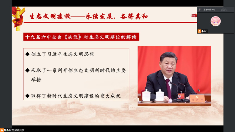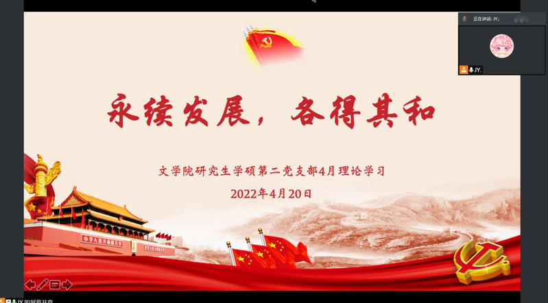 生态环境保护是功在当代、利在千秋的事业。生态环境是关系党的使命宗旨的重大政治问题,也是关系民生的重大社会问题。习近平总书记在参加首都义务植树活动时强调,要推动在全社会,特别是在青少年心中,播撒生态文明的种子,号召大家都做生态文明建设的实践者、推动者,让天更蓝、山更绿、水更清、生态环境更美好。4月20日,苏州大学文学院学硕第二党支部以腾讯会议的形式,开展了“永续发展,各得其和”理论学习活动,支部全体党员参加了本次会议。