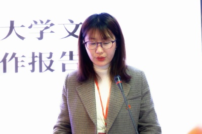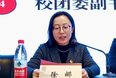 校团委副书记徐娜致辞。徐书记总结了过去四年文学院团委的工作,并提出三点希望:汲取信仰之力,把稳思想之舵;汲取奋斗之力,走好时代之路;汲取创新之力,勇担发展之任。