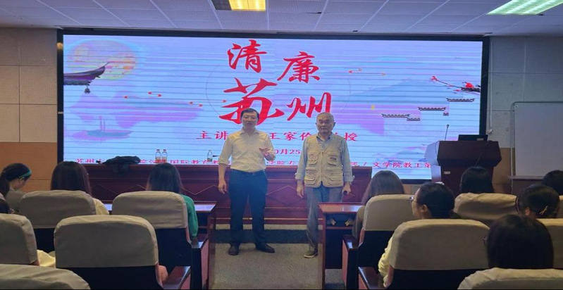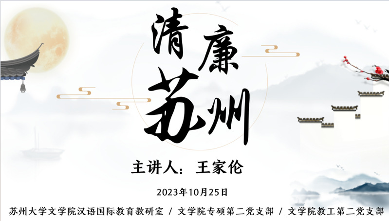 老骥心尚壮,青松色逾新。离退休同志是我们党执政兴国的开拓者、建设者和亲历者,也是我们新一代青年茁壮成长的奠基人、引路人和见证人。党的二十大以来,面对新时代、新要求,我们需要老一辈一如既往的关心、支持与帮助。值此重阳佳节之际,文学院专硕第二党支部联合文学院教工第二党支部,邀请苏州大学文学院教授、硕士生导师,苏州市教育学会语文教学研究会副理事长,苏州市沧浪诗社副社长,文学院离退休支部党员王家伦老师于2023年10月25日下午在文综楼1005-5339报告厅为汉语国际教育专业本硕学生展开《清廉苏州》的讲座。