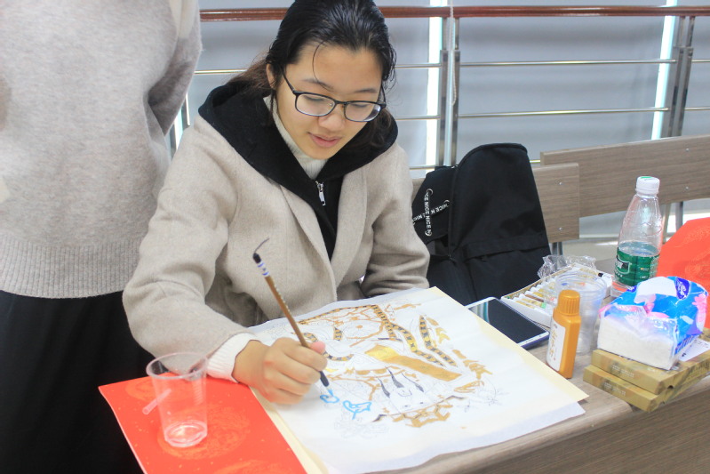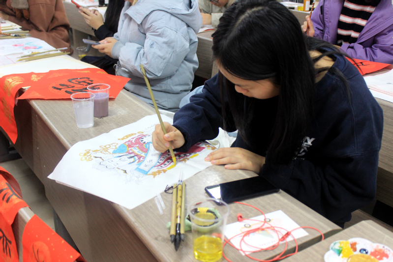 随后,工作人员为在场的每一位同学分发了画纸。同学们拿到线稿后,根据自己对图案的理解,为图案涂上颜色。同学们专心致志、一丝不苟,有的同学还大胆地对传统的人物年画加以创新,添上了现代的流行元素,也有的同学画出了高洁的梅花。