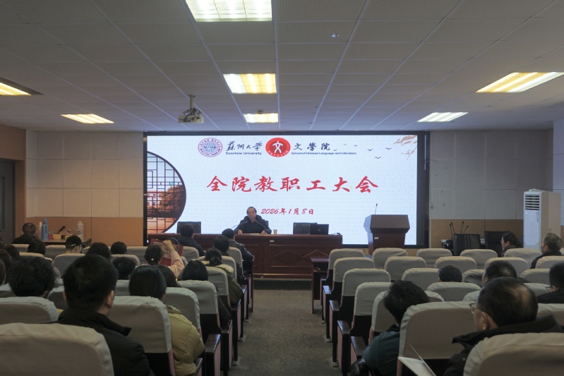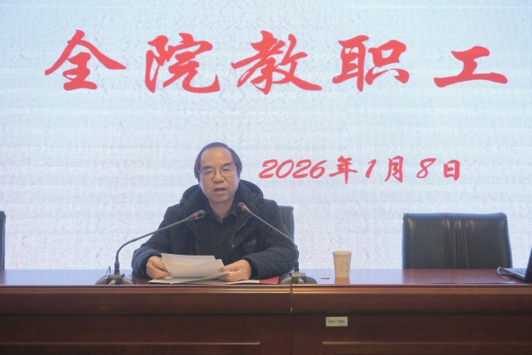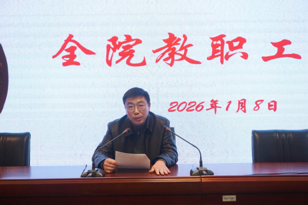 1月8日下午,文学院教职工大会在5339报告厅举行。会议由院党委书记夏凤军主持,全体教职工出席了本次会议。大会主要内容是2025年度中层领导班子和领导干部年度考核、学期末相关工作布置提醒。