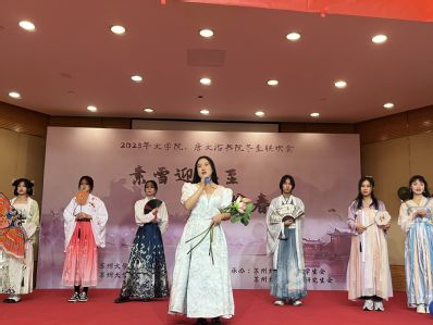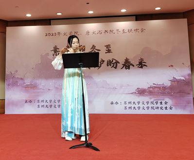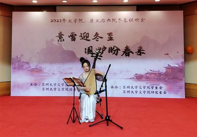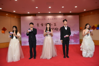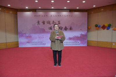 12月21日14:00,“素雪迎冬至,围炉盼春来”——2023年文学院、唐文治书院冬至联欢会在炳麟图书馆学术报告厅如期举行。本次活动由文学院团委主办,文学院学生会、研究生会承办。出席本次联欢会的有文学院党委书记宋清华、文学院党委副书记阴浩、学生办公室主任纪金平、20级21级辅导员陆亚桢、22级23级辅导员丁小珊、研究生辅导员孙薇、研究生辅导员杨兴丽、留学生辅导员王占龙。
