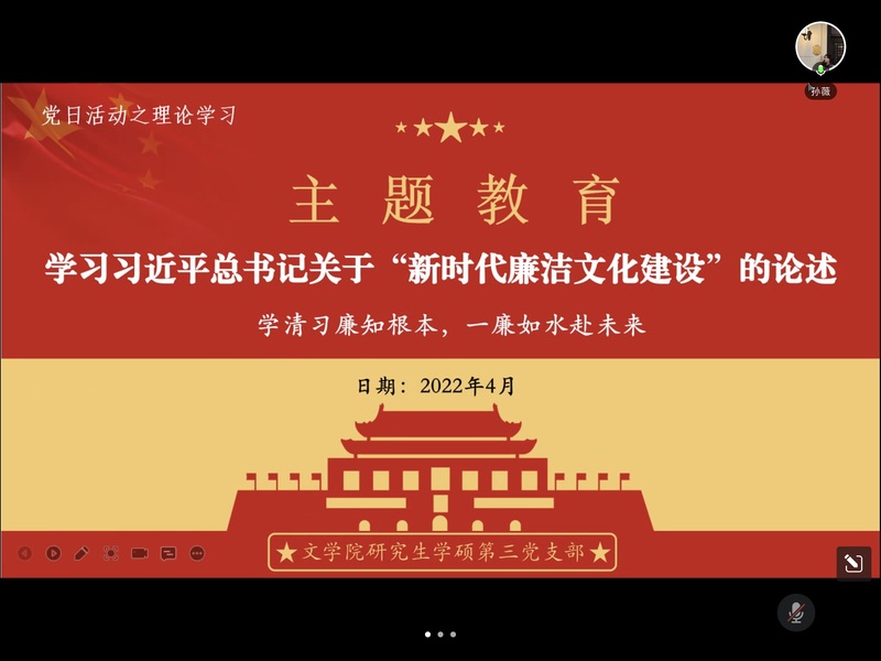 为了向广大党员宣扬廉洁文化知识,增强党员自身廉洁意识,从而推进新时代廉洁文化建设,文学院研究生学硕第三党支部于2022年4月18日线上开展了“学习习近平总书记关于‘新时代廉洁文化建设’的论述”主题教育活动。此次学习由支部书记季鹏飞同志主持,研究生辅导员孙薇同志领学,支部全体党员同志共同学习了“新时代廉洁文化建设”的具体内涵,并踊跃讨论如何在实践中推动廉洁文化建设,鼓励大家积极参与廉洁文化的建设,共同营造和谐清明的社会环境。