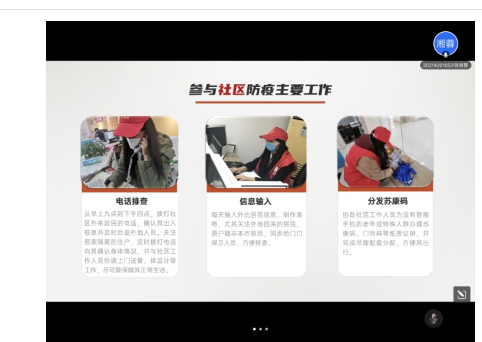 最后,钱湘蓉同志针对防疫抗疫攻坚战分享了亲身经历和深刻感悟。钱湘蓉同志阐明防疫抗疫的理念,即秉承着人民至上、精准施策、动态清零的理念,提高科学精准防控水平,优化疫情防控举措,在以习近平同志为核心的党中央领导下,决战决胜。钱湘蓉同志还分享了自己2020年以来参加防疫志愿工作的经历,生动讲述了这场防疫抗疫攻坚战的不易,强调了全民抗疫中由一股股微小的个人力量汇聚而成的强大凝聚力。支部书记季鹏飞同志对此发表了自己的看法,希望党员同志在积极奉献的同时,还要不信谣、不传谣,注意网络文明,坚决贯彻所在区域的政府管理措施,坚决拥护我们国家的方针与政策,相信只要我们团结奋斗,就一定能获取胜利。