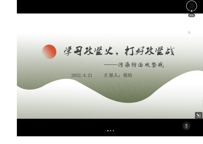 随后,蔡晗同志分享污染防治攻坚战相关内容。蔡晗同志从《关于全面加强生态保护环境深入打好污染防治攻坚战的意见》的发布经过讲起,解读了深入打好污染防治攻坚战的总体要求、主要目标、重点任务和政策措施,并以江苏省为例,介绍了在具体推进污染防治攻坚战时的江苏特色,从目标安排、细化要求、工作谋划、财政支持等方面分享了“江苏绿色发展‘路线图’”,并以图片的形式,展示了江苏各地在污染防治攻坚战中的阶段性成果。
