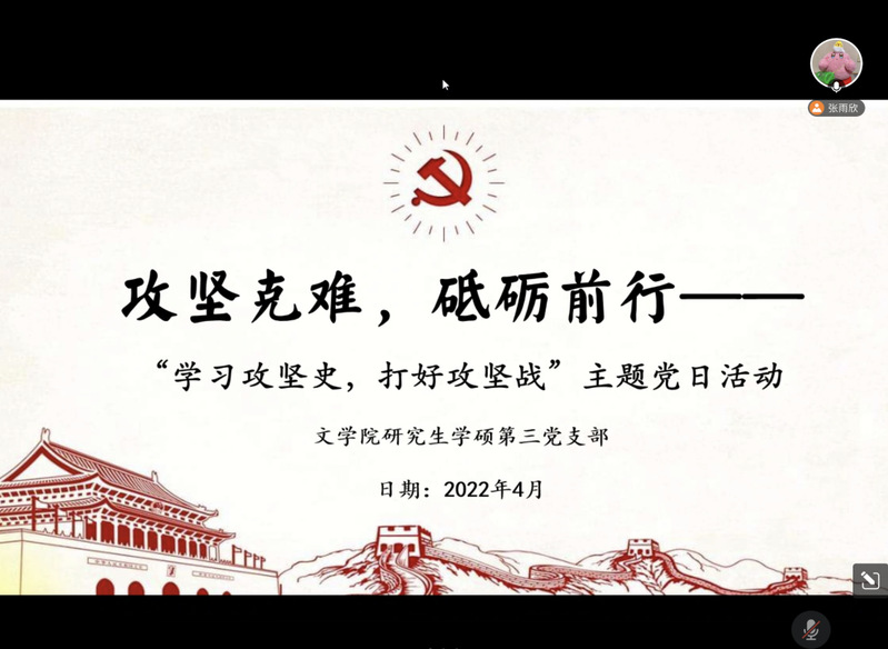 “十三五”期间,我们聚焦全面建成小康社会目标,固根基、补短板、强弱项,脱贫攻坚战取得全面胜利,污染防治攻坚战效果显著,防范化解重大风险攻坚战取得成效,三大攻坚战取得决定性成就。新的征程上,我们要实现第二个百年奋斗目标,更加需要坚持和发扬维护党中央权威和集中统一领导的历史经验,特别是党的十八大以来的新鲜经验,从历史规律性和历史主动性统一的高度,统筹推进“五位一体”总体布局、协调推进“四个全面”战略布局历史新要求,深刻领会实现中华民族伟大复兴的历史必然性,抓住历史机遇,创造更加伟大的事业。值此之际,文学院研究生学硕第三党支部于2022年4月21日线上开展了“学习攻坚史 打好攻坚战”主题党日活动。此次主题党日活动由支部书记季鹏飞同志主持,支部全体成员参加。