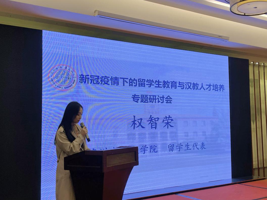 “中国政府优秀来华留学生奖学金”是教育部面向中国政府奖学金院校本科二年级(含)以上或研究生二年级(含)以上的全日制学历生开展的一项年度优秀留学生评选,旨在奖励和表彰知华友华、品学兼优的来华留学生。因申请人数众多、评审要求严格,名额有限,被视为中国政府授予来华留学生的最高荣誉之一。权智荣同学是我院汉语国际教育专业的一名硕士研究生,2020年度在学习科研、社会服务、文化传播等各个领域表现突出,曾多次在江苏省级比赛中获奖,包括江苏省广播电视总台承办的2020“同乐江苏”外国人汉语演讲比赛二等奖、2020年中韩大学生演讲大赛江苏赛区二等奖并进入全国总决赛,是我院留学生的优秀代表。权智荣同学的获奖,为我院其他来华留学生树立了积极的榜样,同时也反映了我院来华留学生教育取得的显著成绩。我院也将继续加强提升留学生教育管理的质量,继续深入留学生教育的管理与服务,为国家、为社会、为学校培养出高质量、全面发展的亲华、友华、爱华的国际人才。