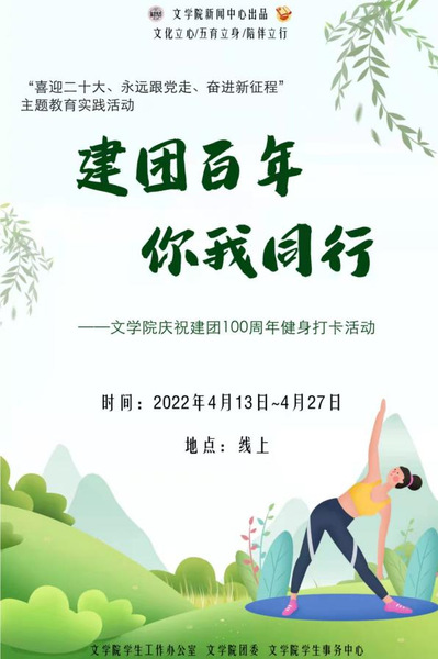4月13日至27日,“建团百年,你我同行”步行打卡活动于线上顺利举行。本次活动由文学院学生工作办公室、团委主办,学生事务与发展中心承办。活动旨在庆祝中国共产主义青年团建团100周年,并号召学生以步数打卡的方式庆祝中国共产主义青年团百年华诞。