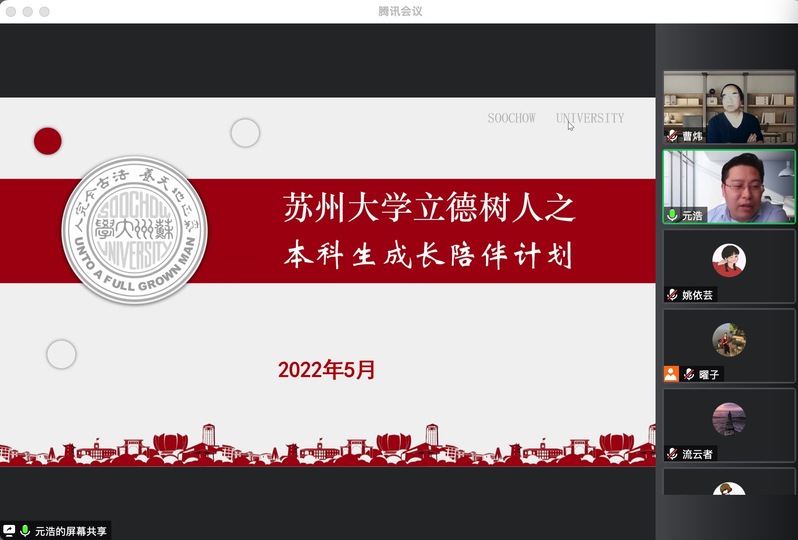 5月6日上午,学院行政人员线上开展了网络安全及《苏州大学立德树人之本科生成长陪伴计划方案》专题学习会议。学院领导班子成员和全体行政人员参加了学习,会议由文学院副院长赵曜主持,党委副书记阴浩、综合办公室副主任于大伟、研究生辅导员孙薇领学。