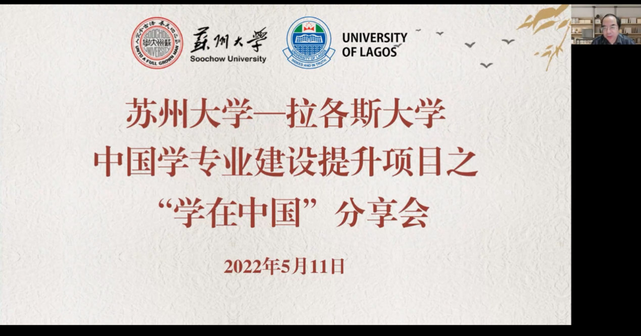 北京时间2022年5月11日19点,苏州大学文学院举办了苏州大学-拉各斯大学中国学专业建设提升项目之“学在中国”分享会,国际合作交流处副处长朱履骅、文学院院长曹炜、副院长赵曜、拉各斯大学中国学专业负责人Banwo博士、拉各斯班授课教师、留学生辅导员、我校尼日利亚留学生和拉各斯大学中国学专业学生出席了本次分享会。会议由海外教育中心主任陶家骏副教授主持。