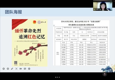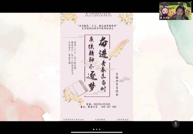 4月28日18:30,“青春献礼二十大,励志逐梦翰墨香”苏州大学文学院2022读书节系列活动之“赓续精神永逐梦,奋进青春正当时”——主题分享交流会在腾讯会议顺利开展,本次交流会由文学院学生工作办公室、团委主办,学生会承办,熊思瑜担任本次交流会的主持人。