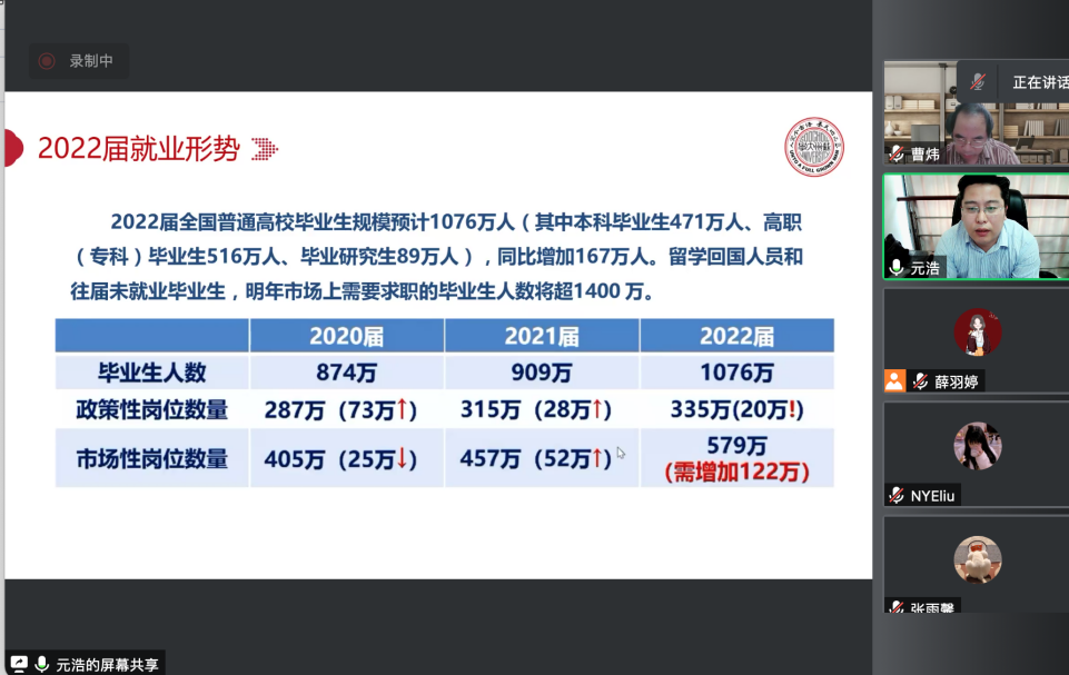 首先党委副书记阴浩总结了2022届毕业季总体工作,具体分析了目前的就业形势和就业目标。阴书记表明学院会贯彻落实“一把手工程”、“全员责任制”,并有序推进“访企拓岗” 促就业专项行动,根据同学们的求职意向等进行一对一辅导、点对点推荐岗位,为大家的就业提供全程服务。接下来,学院会为每一位就业困难学生量身定制帮扶方案,一对一开展个案帮扶指导,并分别给求职受挫学生、暂无就业意向慢就业学生和考公考编学生提供针对性的建议与帮助。最后阴书记阴书记总结道,今年的就业形势更加严峻复杂,希望大家珍惜应届生身份,调整心态,统筹考虑,积极主动寻求就业机会。学院也会充分调动资源,为同学们的就业保驾护航。