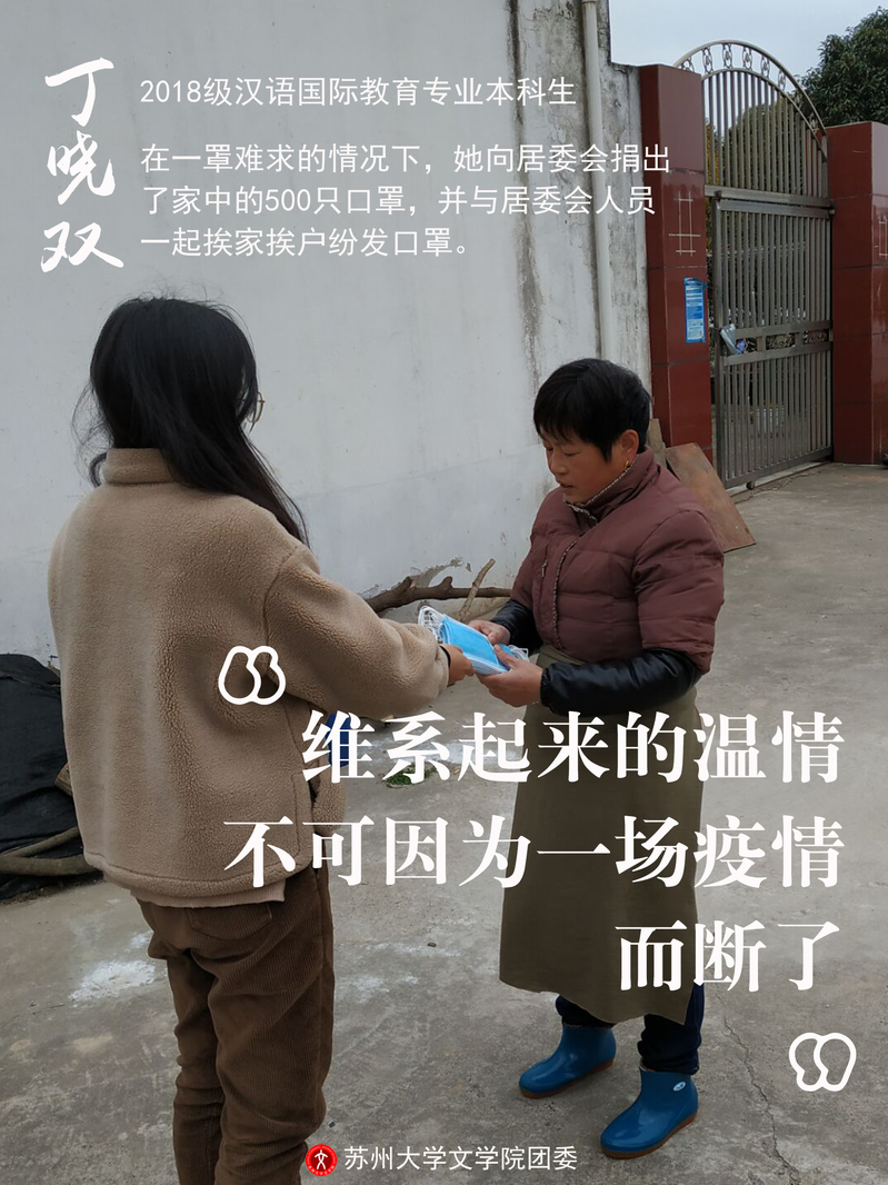 丁晓双同学得知家乡口罩物资告急后,在与父母商量后,决定捐出家中剩余的五百只口罩,支援家乡的防疫事业。她与村委会取得联系后,根据村委会提供的村民名单,将口罩合理分配,保证每家每户都可以收到这份“冬日温情”。2月5日下午,在村委会人员的陪同下,丁晓双同学来到村中挨家挨户分发口罩并演示如何正确佩戴。在分发口罩的过程中,她得知有少数村民仍每天前往人员密集的场所或者不愿佩戴口罩,她便将最新的疫情说给这些村民听,晓以利害,耐心地劝说他们,最终村民们表示愿意配合。