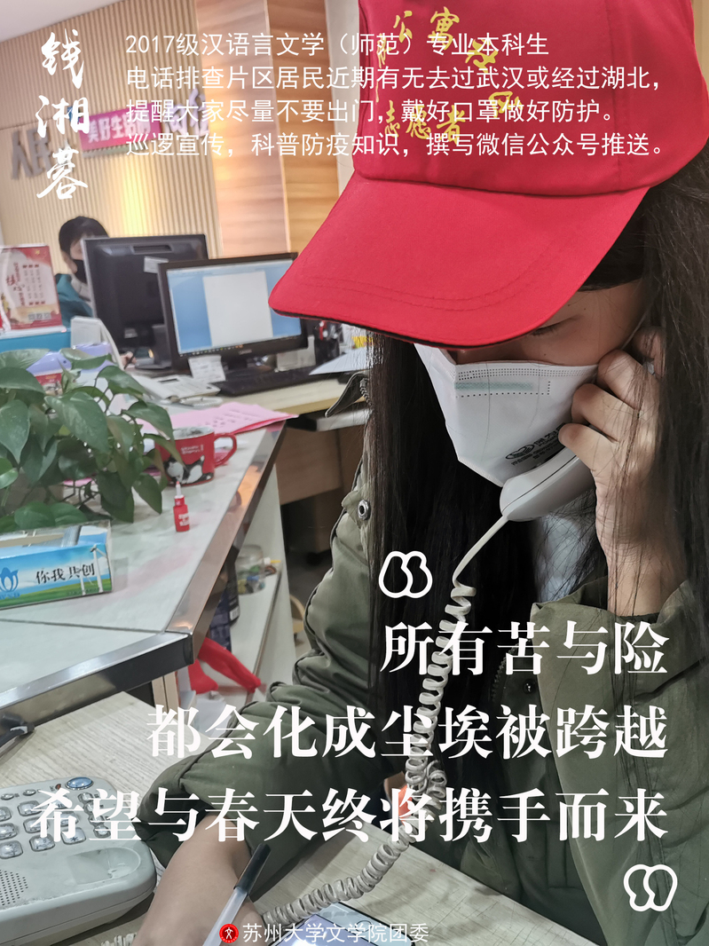 钱湘蓉同学在从事基层防疫工作的父亲的鼓励下,响应街道志愿者的招募,协助社区工作人员应对2月10日前大量外地住户的复工返锡浪潮。钱湘蓉同学的主要工作是拨打社区外来居民的电话,确认其出入信息并及时劝返计划返回无锡的外地人员。她每天需拨打100余通电话,逐个排查其所在的具体位置及返锡日程安排,每日累计劝返30余人。此外,她时刻关注着25位居家隔离的住户,定时拨打电话确认其身体情况,并与社区工作人员协调上门送餐、体温测量等工作。