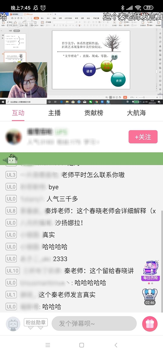 直播结束后,张春晓老师表示B站直播的整体效果流畅,没有任何卡顿或中断,能顺利地完成课堂教学任务。同时,她认为线上的方式能够让学生体会到老师的亲切,又免于学生直面老师的压力,学生提问更大胆更自由,这一点是远超传统课堂效果的。