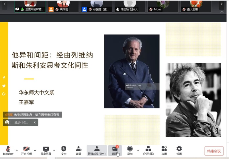第一讲由华东师范大学中文系的王嘉军教授开讲。王嘉军教授系华东师大中文系副主任,博士生导师,中国文艺理论学会理事,上海市曙光学者,上海市青年拔尖人才,曾出版和翻译了《存在、异在与他者:列维纳斯与法国当代文论》《叔本华和崇高理论》《时间与他者》等著作,是享誉学界的青年学者。他讲座的题目是《他异与间距:经由列维纳斯和朱利安思考文化间性》。王嘉军教授以深入浅出的语言,介绍了列维纳斯思想的三种差异,提出结合朱利安的阐述,可以通过这三种差异来区别三种思考“文化间性”的方式,即不同性将不同文化视为统一性的不同部分; 陌异性将他者文化视为一种异域和异质性; 他异性则将他者文化视为永不可被自我所把捉的伦理对象。与此同时,他也提醒我们,必须充分意识到二者的思想差异。列维纳斯的他异思想强调的是他者对于自我的优先性,朱利安的间距思想则强调透过他者对自我的反思。在跨文化交流中,一方面,“间距”思想所追求的“可理解的共通”可以平衡“他异”思想中自我和他者的不对称性; 另一方面,他异思想中他者导向的伦理学也是间距思想的必要补充,在对他者的责任中,必然会产生间距。他异和间距之思最终都需要落实于生活,也只有通过回归生活的素朴性和复杂性,才能够激活列维纳斯和朱利安的思想,并克服他们思想中的局限。相应的,也应该将基于他异和间距的跨文化 交流,从理解拓展到生活。这种跨文化生活不只会拓展主体的自由和可能性,同时也是抵御资本主义全球化的方法。