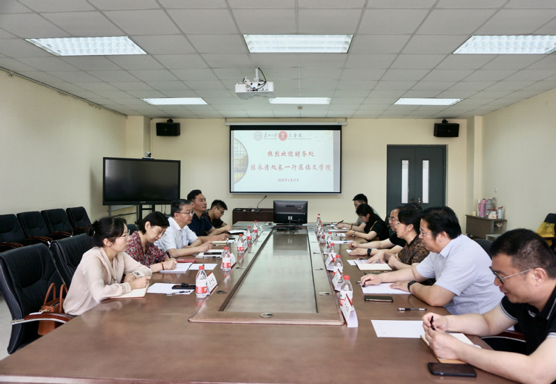 2022年6月21日上午10点,财务处处长陈永清、副处长施小平、财务信息科科长李洋、综合科科长杨杰、会计核算科副科长王一乐等一行莅临我院指导财务工作。文学院院长曹炜、党委书记宋清华、党委副书记阴浩、副院长周生杰、副院长赵曜、综合办公室副主任于大伟、培训中心主任徐永、科研财务助理姚依芸参加了本次会议。
