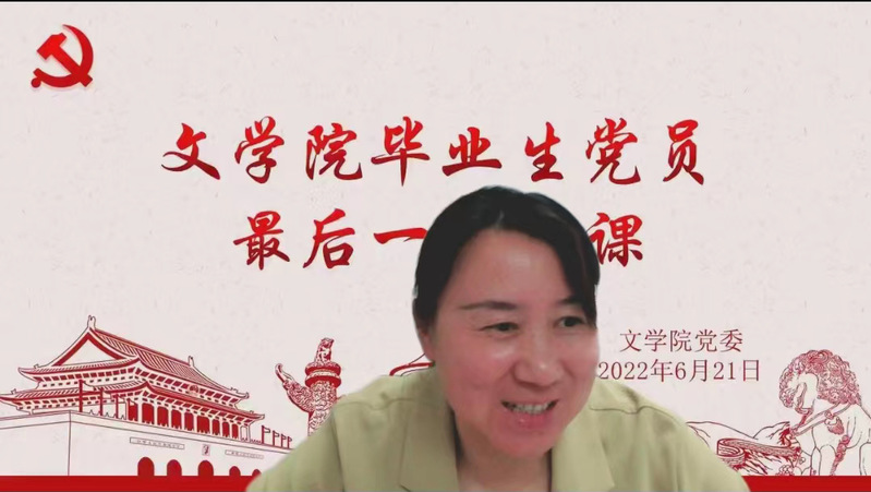 2022年6月21日,文学院党委组织毕业生党员在腾讯会议开展离校前集中教育活动。学院党委书记宋清华主持,学院党委委员艾立中教授给毕业生党员讲离校前的最后一次党课,党委副书记阴浩以及2022届全体毕业生党员参加了此次活动。