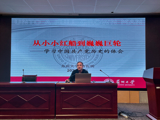 动员大会结束以后,苏州大学党委委员、招生就业处处长查佐明为在场师生上了一堂别开生面的专题党课《从小小红船到巍巍巨轮》。党课伊始,查处长以习近平总书记的发言指示为线索,将学习党史的意义娓娓道来,学党史使人悟思想、办实事、开新局。随后,查处长带领众人重温了中国共产党百年党史中的辉煌篇章,从中共一大到秋收起义到红军长征,再到新中国成立、抗美援朝,中国共产党的历史可谓是一部为中国人民谋幸福、为中华民族谋复兴的历史。最后,他强调,回望过往的奋斗路,眺望前方的奋进路,新时代的党员同志应当积极响应习近平总书记的号召,做新时代的奋斗者,用美好青春诠释共产党人的初心与使命,谱写新时代的青春之歌。